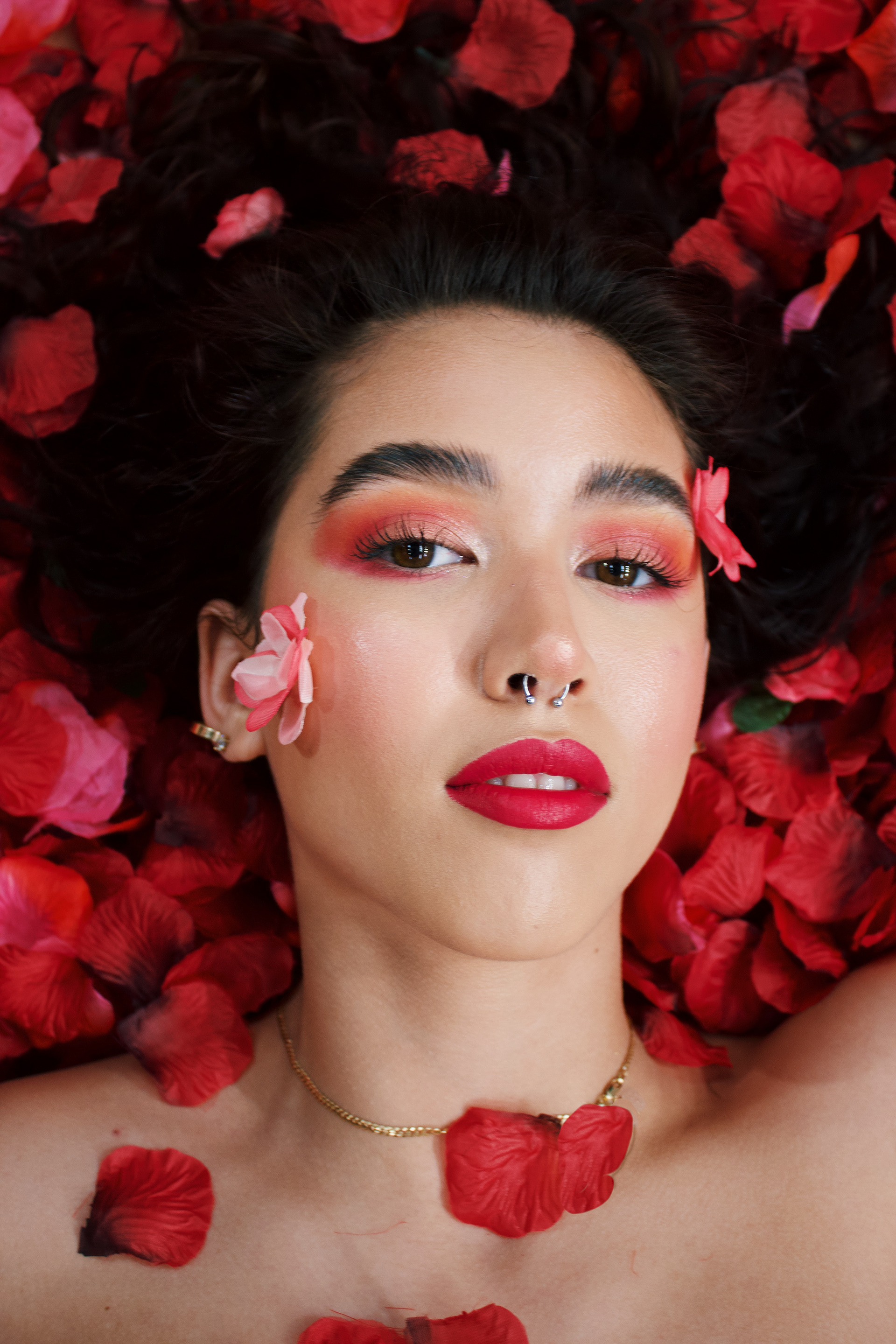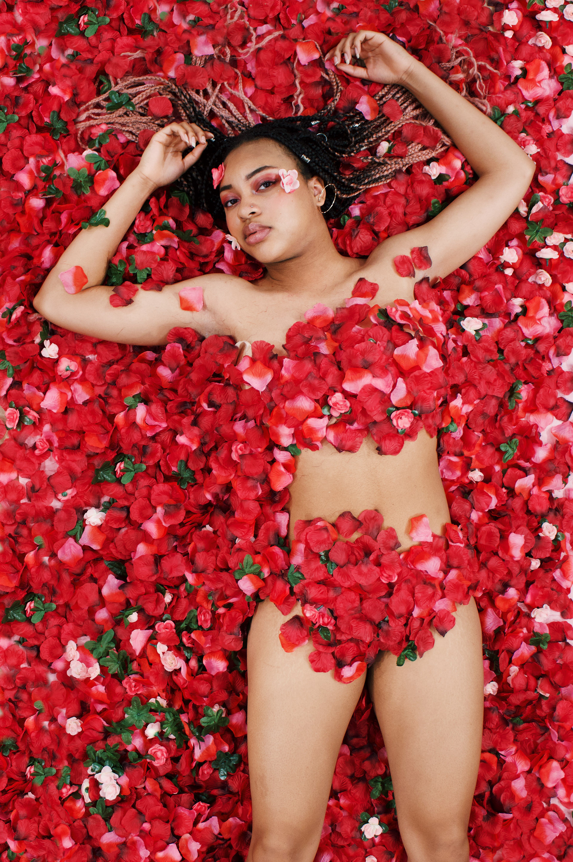 The shoot was inspired by model and photographer Kimberly Douglas. In addition to drawing inspiration from her floral shoot, the project alludes to the falling roses scene from the film American Beauty and the classic trope of flowers in the bedroom. Consequently, I decided to capture models lying in a bed of flower petals creating an equally beautiful yet suggestive piece.