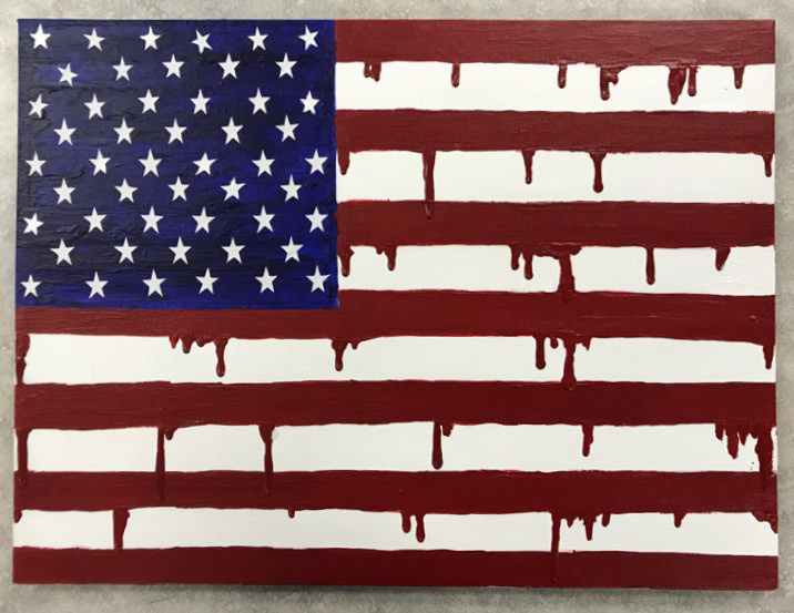This American flag is painted on a large canvas utilizing acrylic paint which is dripped in red throughout the piece. I made this piece to provoke thought regarding our nation. America has a very messy past. This past, along with the present, encompasses the bloodshed of millions of people. Whether it be soldiers on the battlefield, civilians embracing daily life, or the Native Americans who place in this country often remains ignored, lives have been and continue be lost at the hands of American; so what truly is the cost of freedom?
