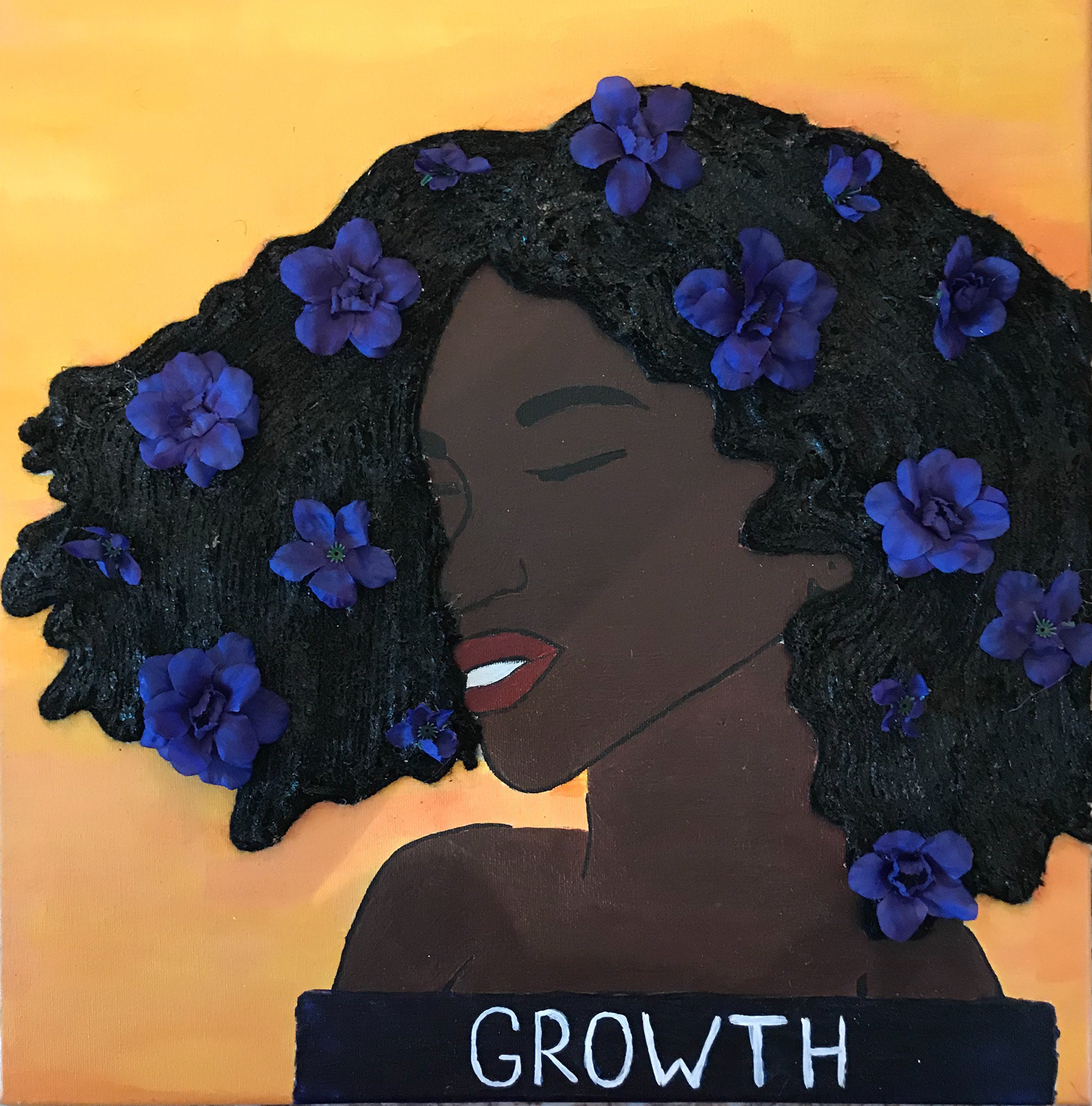 Created with acrylic, yarn, and flowers on canvas, this piece reflects the importance of self-love and continual growth beyond the limitations placed on individual groups by society. For many Black women, understanding one’s hair is a form of coming of age and self-love going beyond hair growth and implying self-growth as one begins to detach themselves from the “flaw” of having Black hair. This piece highlights the importance of unlearning the standards of beauty that are pushed on to us from such a young age and instead seeking transformation in the freedom of self-expression and the continuous evolution of the mind, body, and soul.